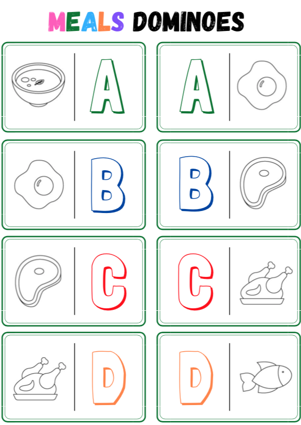 Il primo giocatore deve posizionare una tessera sul tavolo, il giocatore successivo dovrà attaccare una delle proprie tessere alla tessera disposta sul tavolo solo se l’elemento rappresentato su una delle due metà della tessera è uguale all’elemento rappresentato su una delle metà della tessera già disposta sul tavolo, altrimenti passa il turno. Per ripassare i vocaboli prova a ripetere il nome del cibo quando attacchi la tua tessera ad una già presente sul tavolo, se sbagli salti il turno e tocca all’altro giocatore continuare.