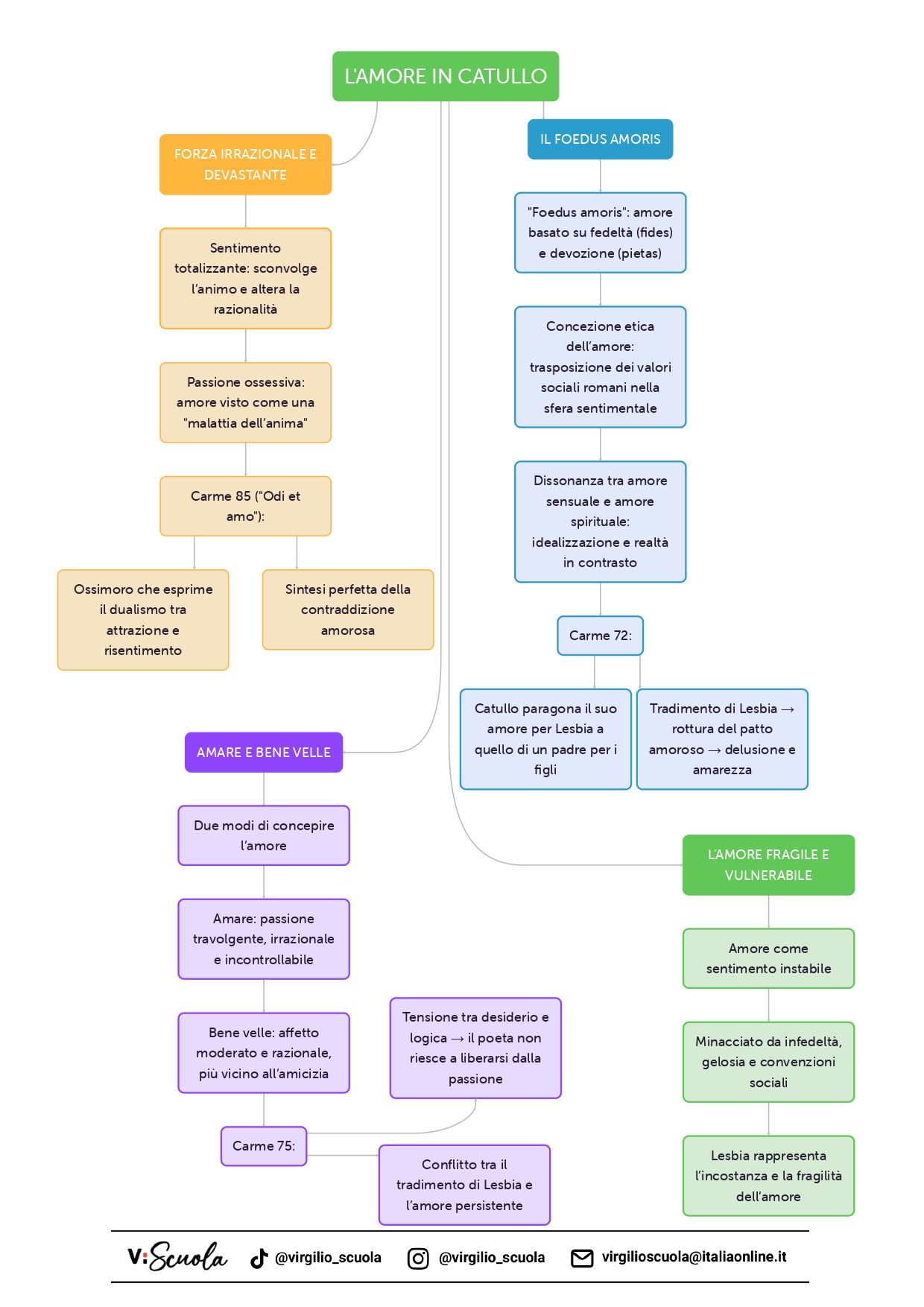 Catullo introduce il concetto di foedus amoris, ovvero un patto d’amore basato su valori quali la fides (fedeltà) e la pietas (rispetto e devozione). Egli trasferisce alla relazione amorosa i principi che tradizionalmente regolavano i rapporti sociali e familiari nella società romana, attribuendo all’amore una dimensione etica e morale. Questo patto implica un impegno reciproco e una lealtà che, tuttavia, vengono spesso traditi, generando nel poeta sentimenti di amarezza e disillusione.