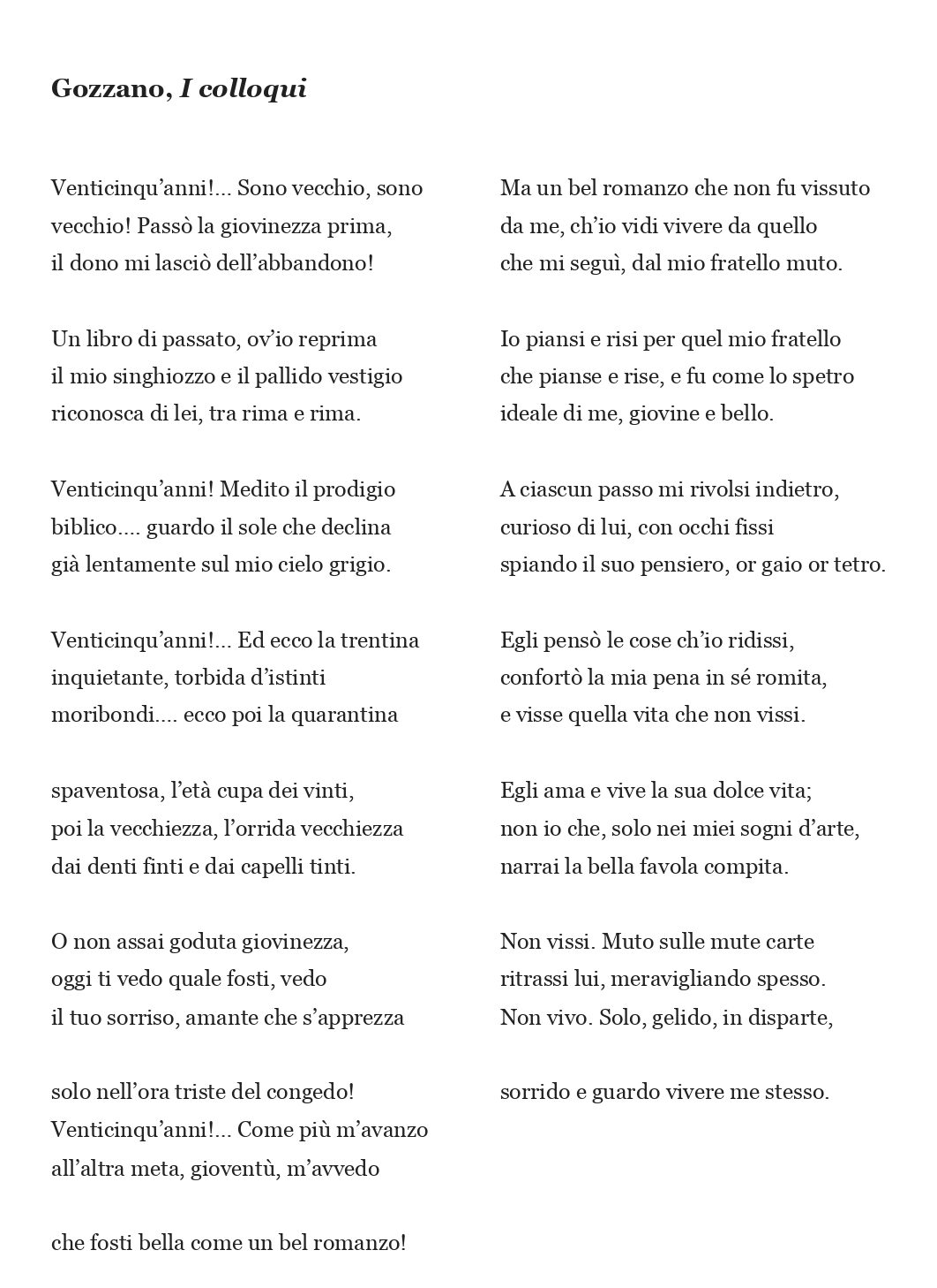 Il primo componimento, come pure l’ultimo, è intitolato proprio I colloqui. Qui Gozzano esprime il rimpianto di una giovinezza non vissuta, con uno stato d’animo di nostalgia e malinconia.