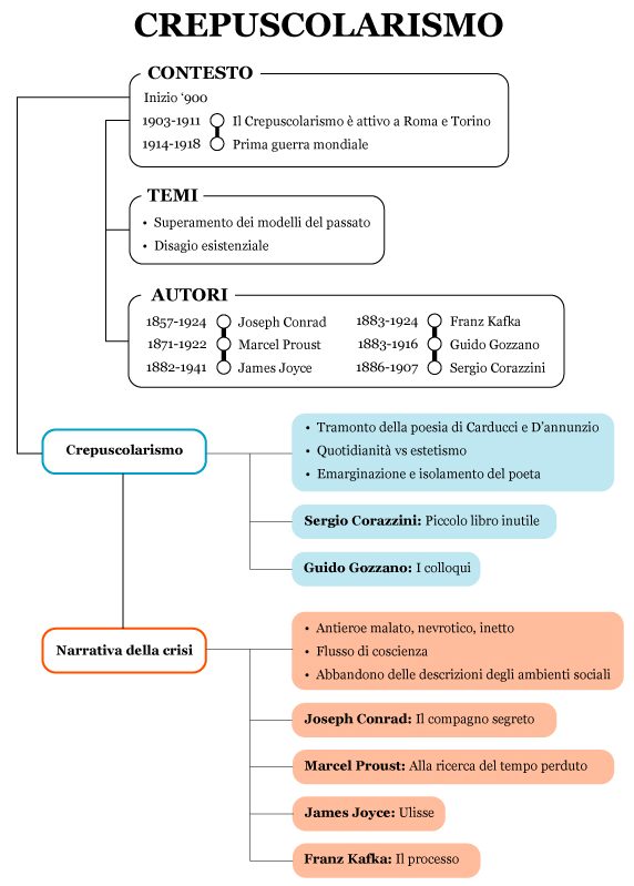Per stampare la mappa con le informazioni principali sul Crepuscolarismo e sul romanzo della crisi, scarica il pdf in bianco e nero qui: