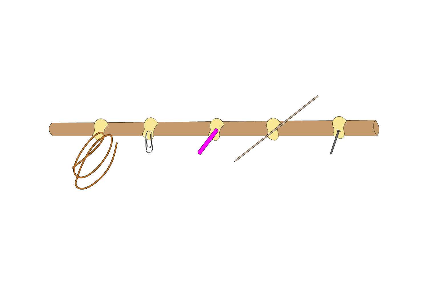 Fissiamo gli oggetti (un filo di rame, una graffetta, un pezzetto di cannuccia, stuzzicadenti di spiedini e un chiodo di ferro) al bastoncino di legno utilizzando della cera scaldata.