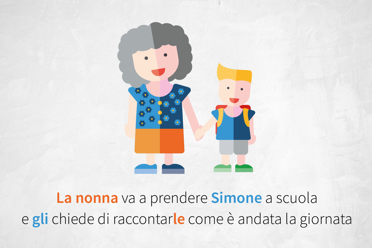 Anche i pronomi vanno tenuti d’occhio per comprendere quello che leggi. Possono prendere il posto dei nomi di personaggi già apparsi nel testo ed è importante capire a chi si riferiscono per non fare confusione. Per capire cosa significa una frase come “La nonna va a prendere Simone a scuola e gli chiede di raccontarle come è andata la giornata", per esempio, devi tenere presente che “gli" sta per “a Simone" e “raccontarle" equivale a “raccontare alla nonna".