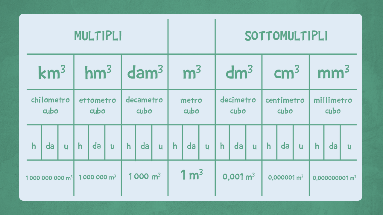 Le misure di volume seguono la base 1000, quindi ogni unità di misura può essere espressa con tre cifre: una per le centinaia, una per le decine e una per le unità.