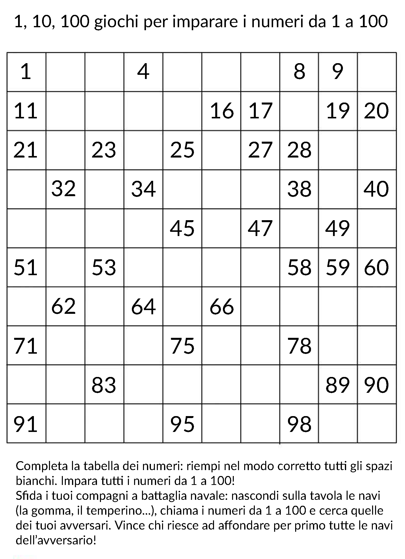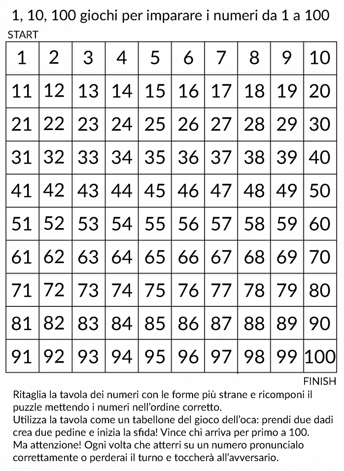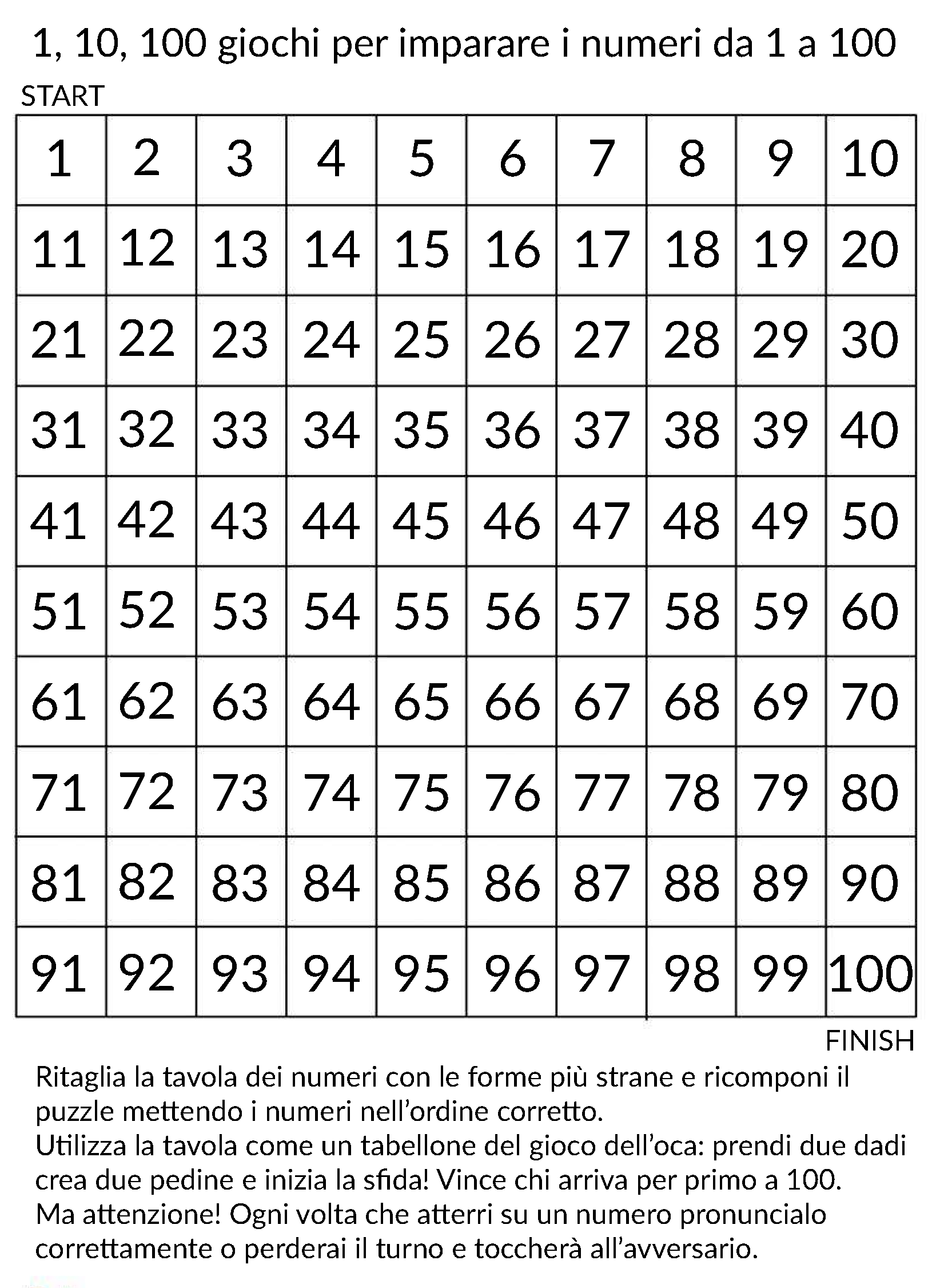 - la tabella dei numeri può diventare un tabellone per fare un gioco dell’oca, dove il numero 100 è l’arrivo: i bambini lanciano due dadi e si muovono in avanti di quanto indicato (se esce un 2 e un 6, si spostano di 8 numeri in avanti). Superano il turno solo se leggono correttamente il numero su cui sono arrivati dopo aver lanciato il dado. In caso contrario, perdono il turno e tocca all’avversario.