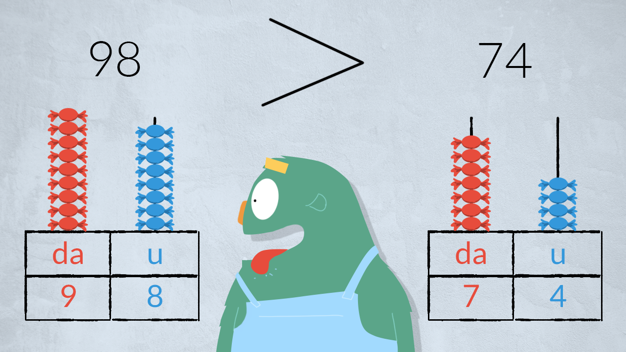 Qual è il numero più grande tra 74 e 98? Controlla sempre il numero delle decine e quello delle unità per deciderlo. 98 è maggiore di 74, quindi 98 > 74.