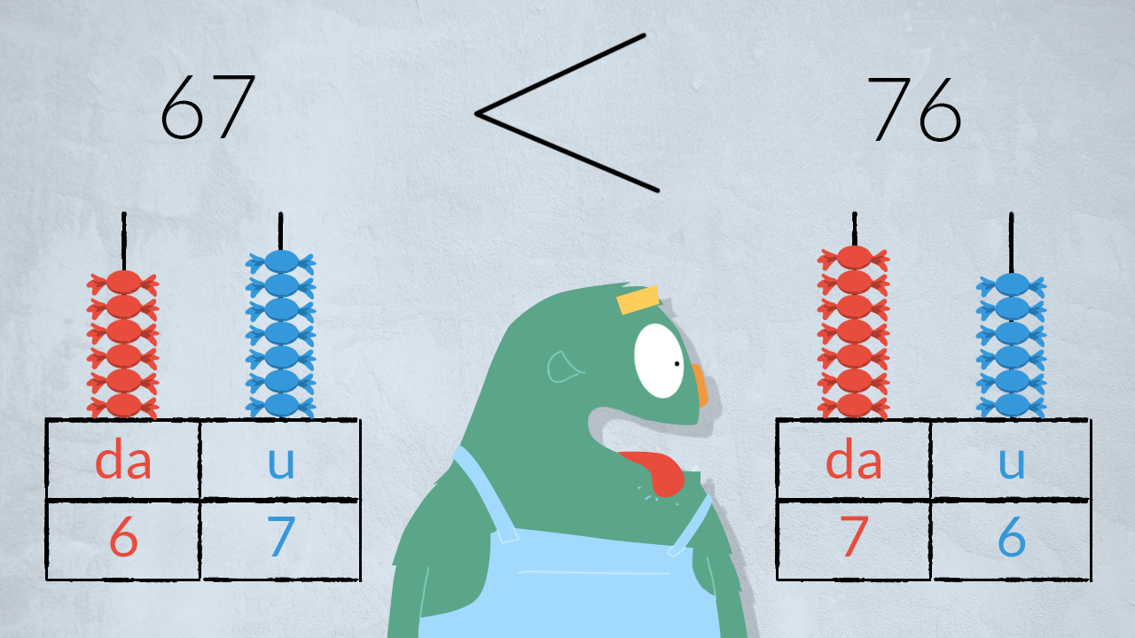Qual è il numero più piccolo tra 67 e 76? Anche se le cifre sono le stesse, la posizione dà a ciascuna un valore diverso. 67 ha 6 decine e 7 unità, mentre 76 ha 7 decine e 6 unità. Quindi il numero minore è il 67 e scriviamo 67 .