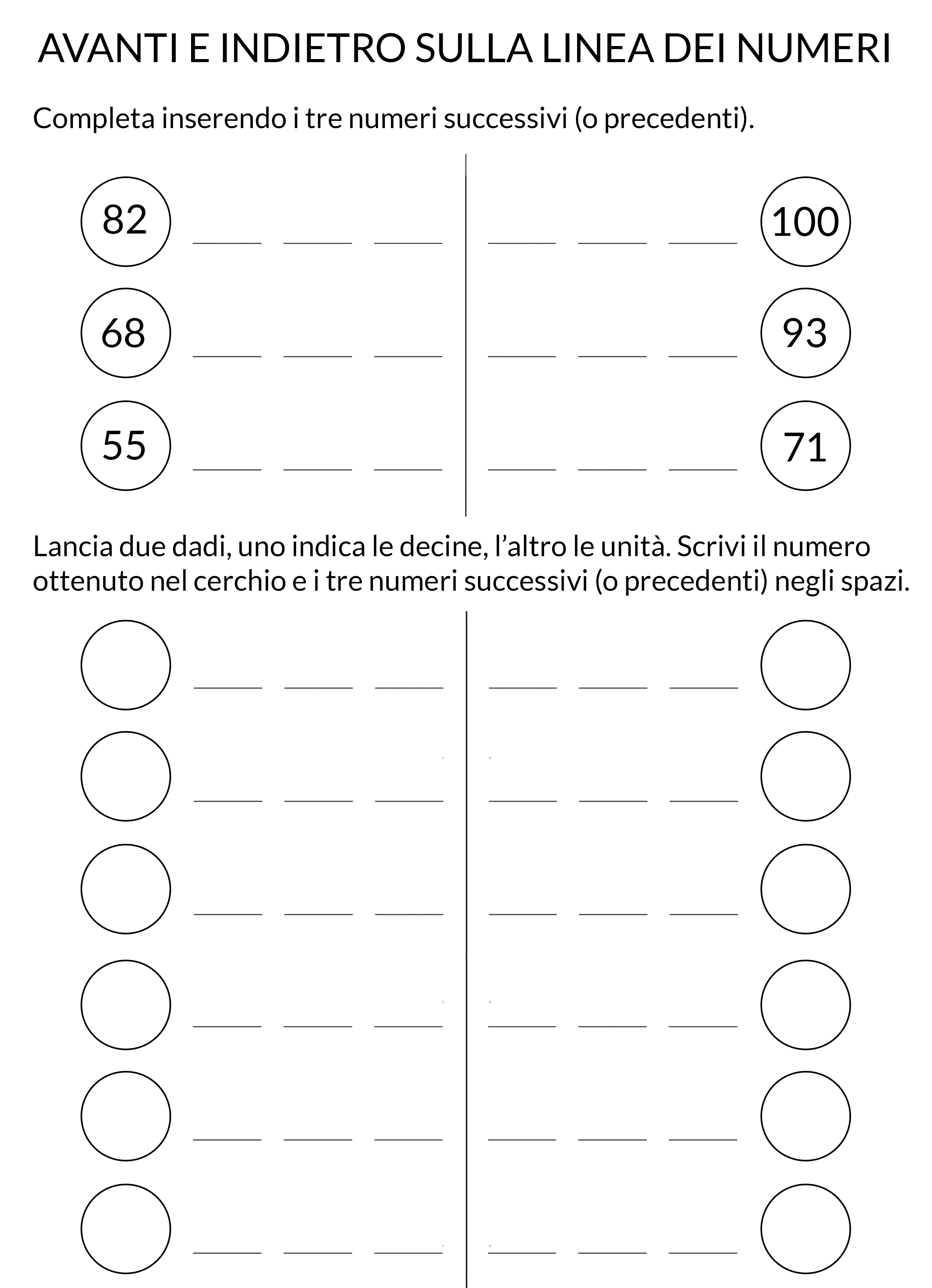 Possiamo fare lo stesso esercizio con l’aiuto di due dadi. Lanciate i due dadi (sarebbe bello averne uno rosso e uno blu, così che uno indichi le decine e uno le unità): i bambini devono scrivere il numero che realizzano dal lancio dei due dadi e i 3 numeri successivi (o precedenti) sulla scheda.