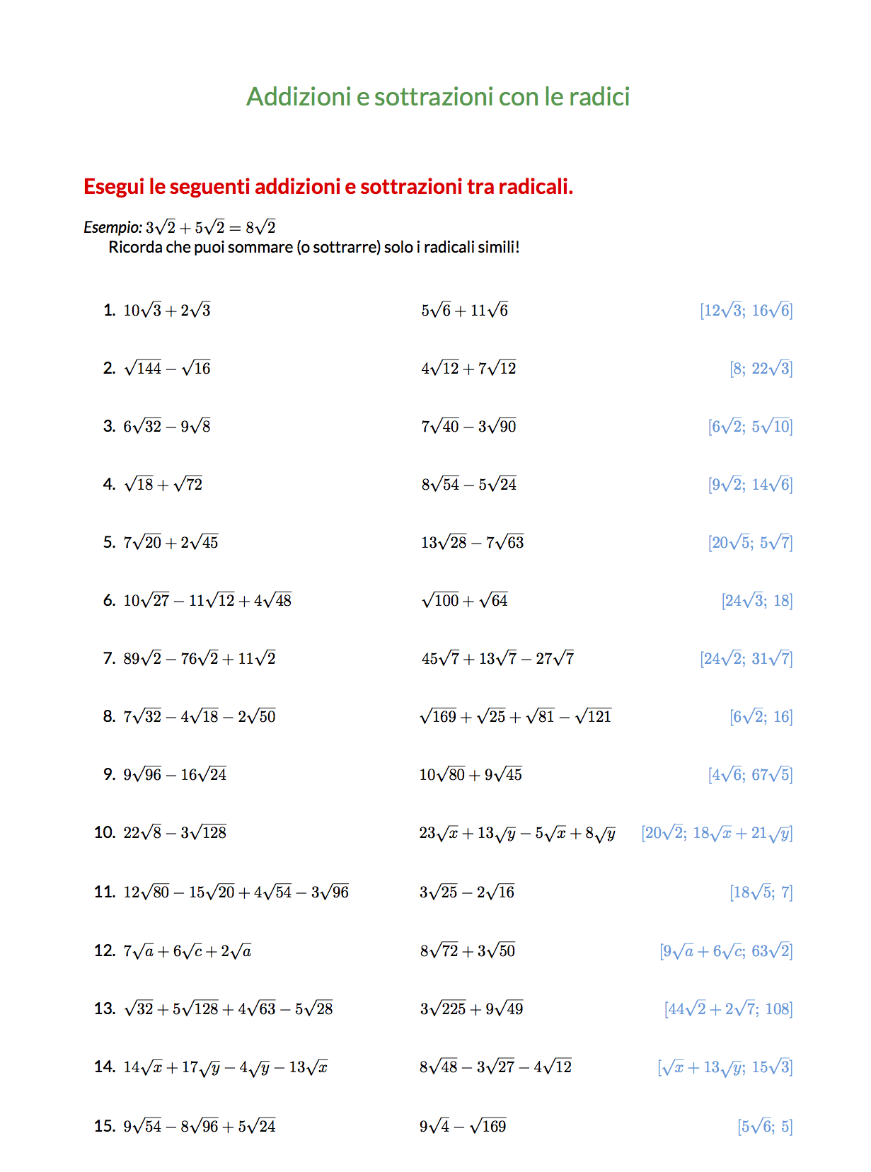 Fai pratica con le radici: esercitati a risolvere queste espressioni per arrivare preparato al prossimo compito in classe. Nella colonna a destra troverai le soluzioni per controllare se hai fatto bene il tuo lavoro.