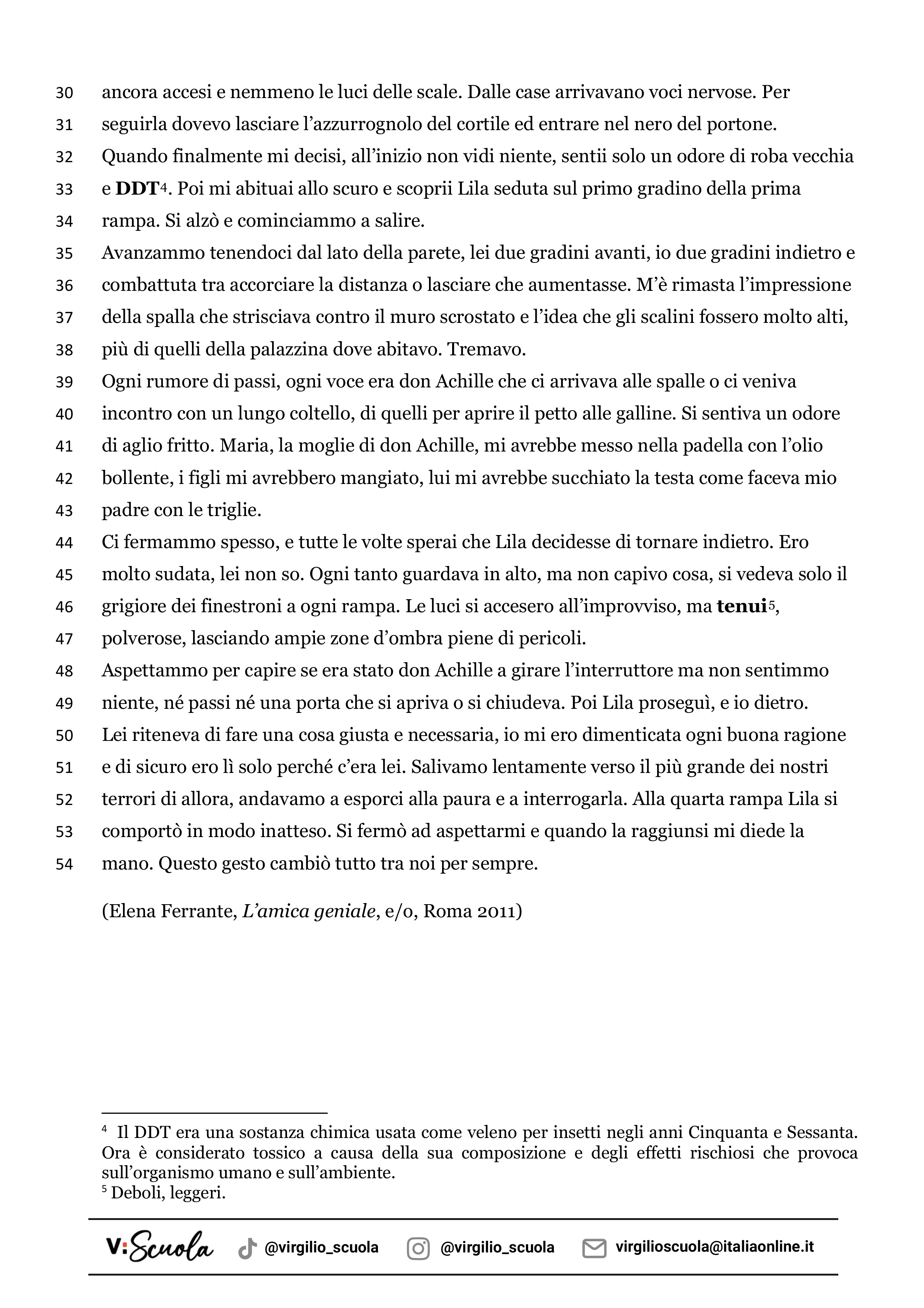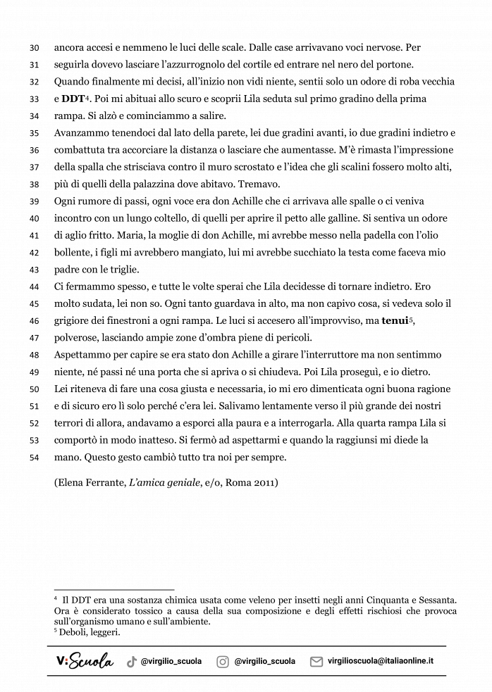 Nella scheda trovi un brano tratto dal libro L’amica geniale. Il romanzo racconta la storia dell’amicizia che nasce tra due bambine. Il racconto è ambientato nella Napoli degli anni Cinquanta, in un quartiere molto povero, dove le due trascorrono la maggior parte del tempo insieme, a scuola e fuori. Il loro è un rapporto basato sulla sfida e la competizione. Il seguente brano racconta però di un evento che ha portato questo rapporto a divenire una vera e propria amicizia, che le accompagnerà durante la loro crescita.