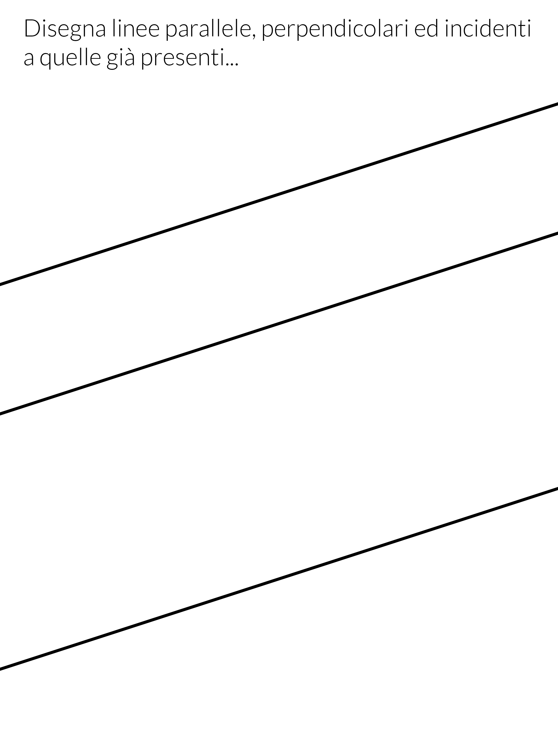 A partire da queste tre rette, lasciate gli alunni liberi di sbizzarrirsi, armati di righello e matita, per disegnare rette parallele, perpendicolari o incidenti. Completate l’opera con una bella mano di colore e confrontate tutti i risultati di questa attività. Capito come funzionano parallele e perpendicolari?