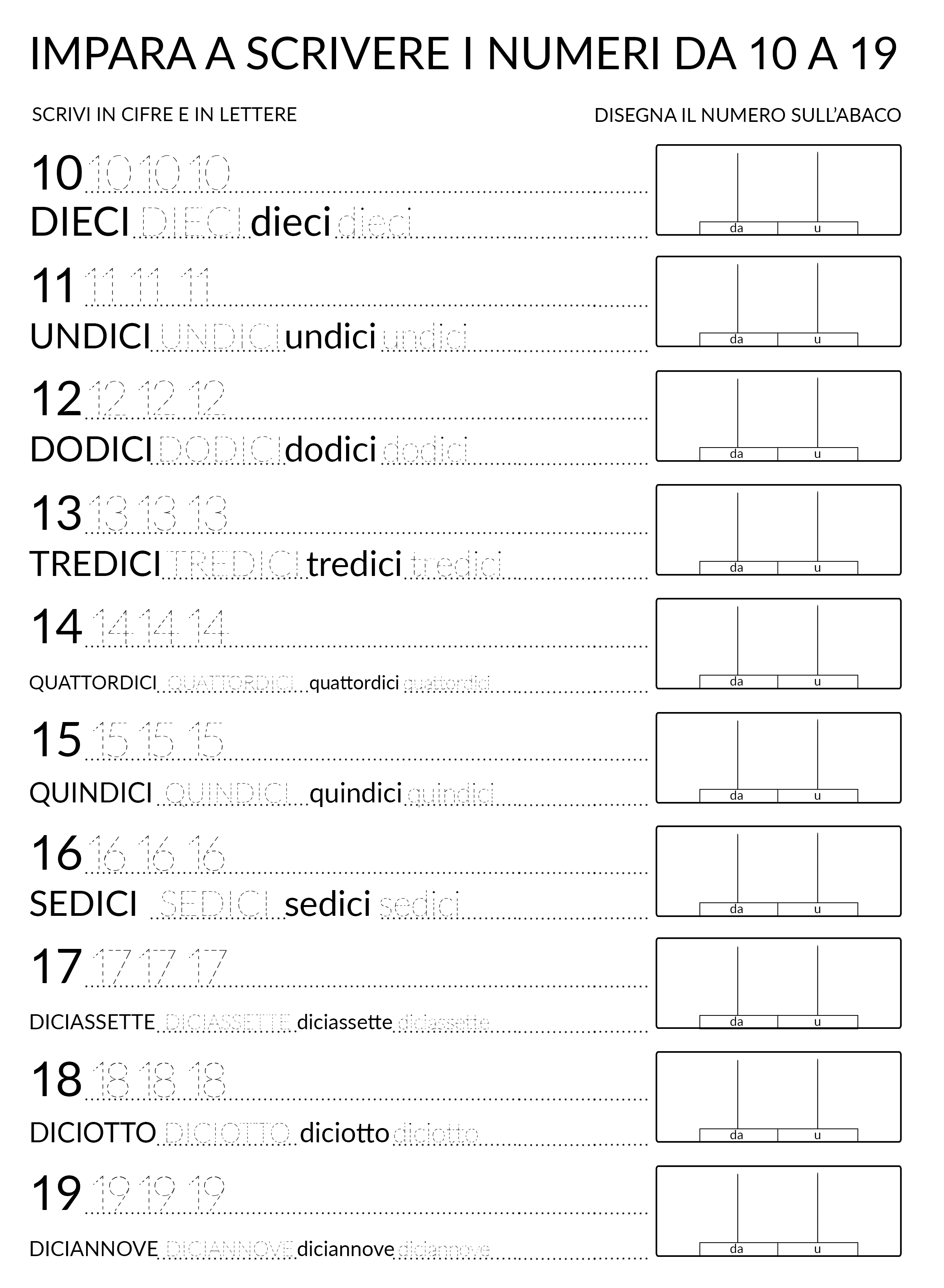 I bambini iniziano a scrivere in stampatello minuscolo, fate completare la scheda di scrittura dei numeri da 10 a 19.