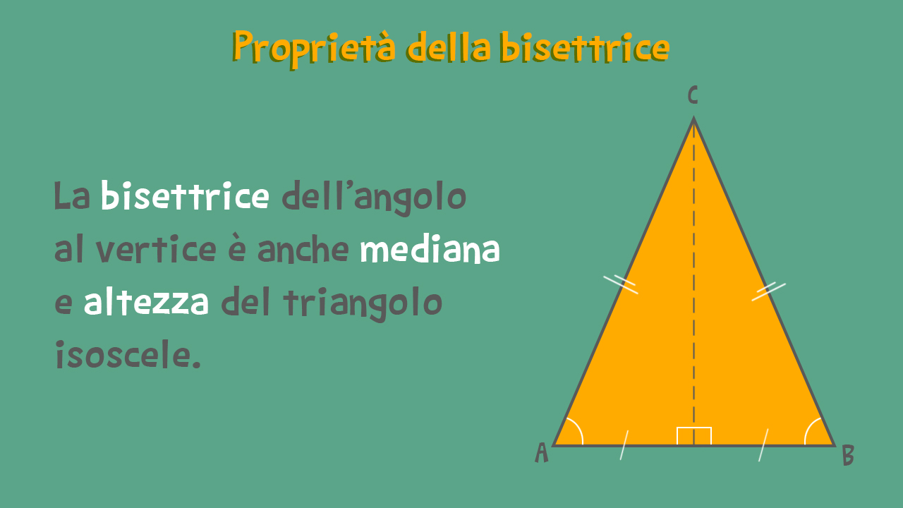 Nei triangoli isosceli: la bisettrice dell’angolo al vertice è anche mediana e altezza.