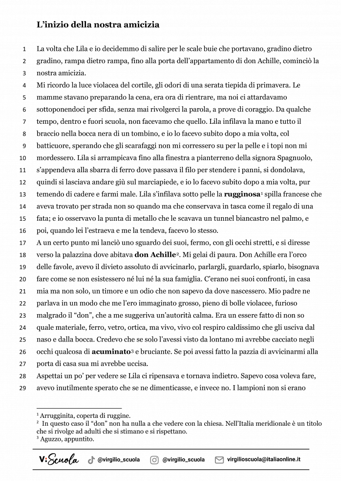 Nella scheda trovi un brano tratto dal libro L’amica geniale. Il romanzo racconta la storia dell’amicizia che nasce tra due bambine. Il racconto è ambientato nella Napoli degli anni Cinquanta, in un quartiere molto povero, dove le due trascorrono la maggior parte del tempo insieme, a scuola e fuori. Il loro è un rapporto basato sulla sfida e la competizione. Il seguente brano racconta però di un evento che ha portato questo rapporto a divenire una vera e propria amicizia, che le accompagnerà durante la loro crescita.