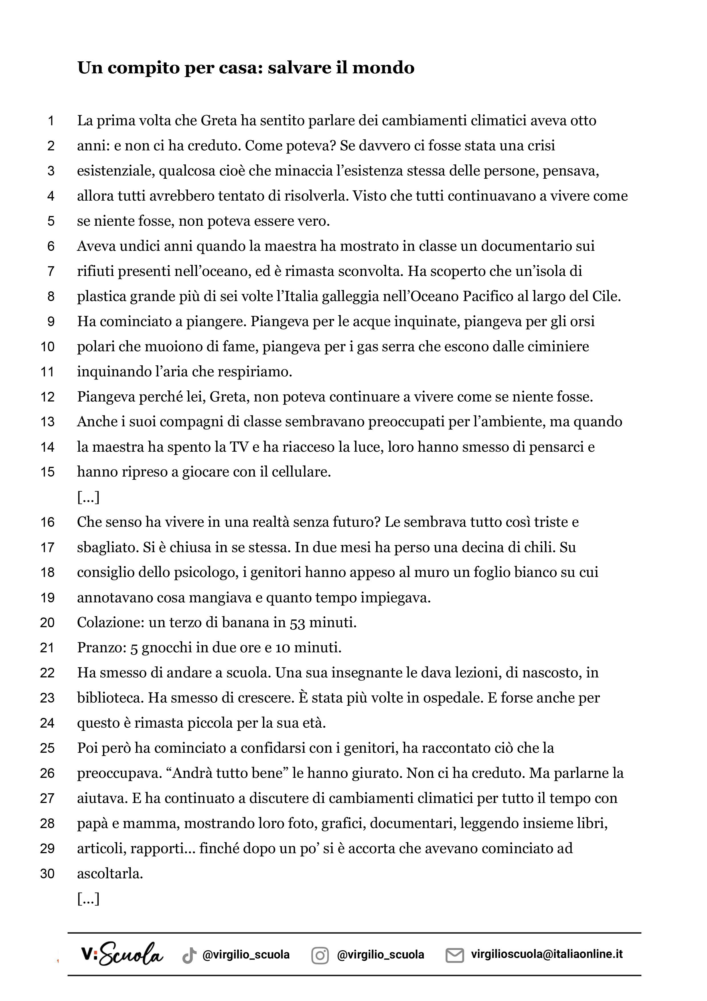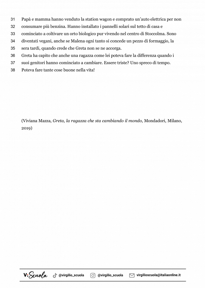 Nella scheda trovi un brano tratto dal libro Greta, la ragazza che sta cambiando il mondo. Una biografia che racconta la storia di Greta Thunberg e le ragioni che la spingono a manifestare in tutto il mondo. Il brano si intitola Un compito per casa: salvare il mondo. Ti aiuterà a esercitarti nella lettura e nella comprensione di un testo.